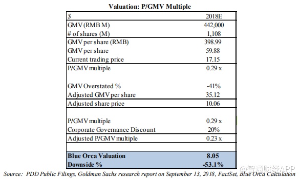 我们的估值是保守的,尽管我们在股价/调整后的销售额的估值计算中使用的乘数非常慷慨,但是,公司歪曲财务业绩,夸大了被经常使用且被密切关注的经营指标,以及参与未公开的关联方交易,并不值得以如此高的估值进行交易。因此,虽然我们按股价/调整后的销售额对PDD的评估价为7.10美元,按股价/调整后的GMV对PDD的评估价为8.05美元,我们预计一些投资者可能会像我们一样会得出结论:PDD根本不值得投资。
