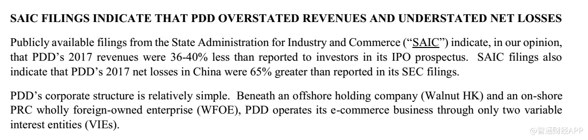 在我们看来,国家工商行政管理局(“SAIC”)公开文件表明PDD 2017年的收入比其IPO招股说明书中向投资者报告的收入低36-40%。 国家工商行政管理局的文件还表明,2017年PDD 在中国的净亏损比向美国证券交易委员会提交的文件中报告的高出65%。
