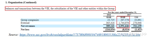 在这种情况下,PDD的SAIC文件很简单,因为据称公司仅从两个VIE实体中就获得2017年100%的收入。根据美国证券交易委员会提交的文件,这两家公司2017年的总收入合计为人民币19.5亿元,其中外部收入为人民币17亿元,公司间收入为人民币2.076亿元。