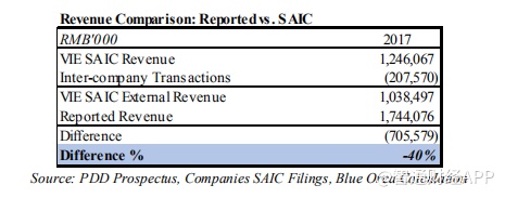 根据投资者选择如何处理公司间交易,我们认为,国家工商局的文件可信地表明,PDD 2017年真实的收入比披露给美国投资者的PDD向美国证券交易委员会提交的文件中报告的收入低36-40%。