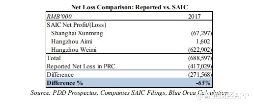 a. SAIC备案文件还显示,拼多多低估了其净亏损。中国和美国公认会计准则(GAAP)的收入确认规则是相似的,因此Blue Orca认为无法解释SAIC申报文件与拼多多在SEC备案的财务数据之间的差异。此外,在比较不同文件中的盈利能力时,任何收入确认上的差异都应该被消除。拼多多报告称,2017年在中国的净亏损仅为4.17亿元。但若把拼多多的两家VIE实体及其母公司(一家外商独资企业)的净亏损加起来,SAIC备案文件显示2017年拼多多在中国的净亏损为6.89亿元。这比披露给美国投资者的亏损额要高出65%。