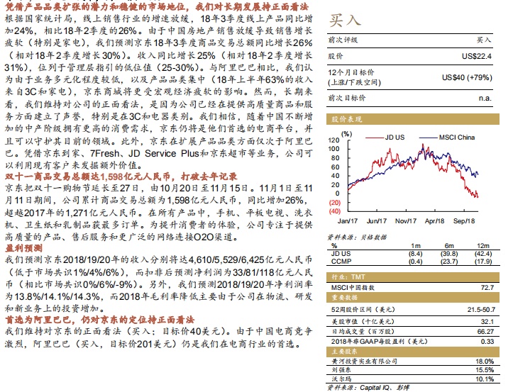 京东商城(JD.US)凭借稳固的市场地位和产品品类扩张,招商证券国际对京东长期发展保持正面看法。与阿里巴巴相比,由于京东业务集中及电子和家用电器的高品类占比,京东商城受宏观经济疲软的影响更大。由于京东加快投资,短期利润率仍然承压。双十一商品交易额(11月1日至11日)达1598亿元人民币,超越2017年的1271亿元人民币,同比增长26%。