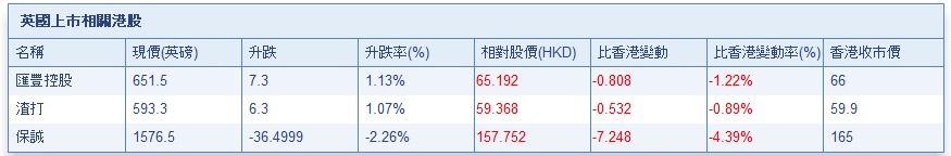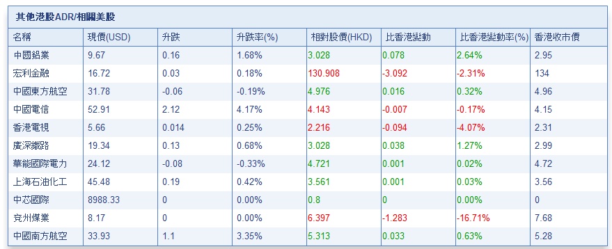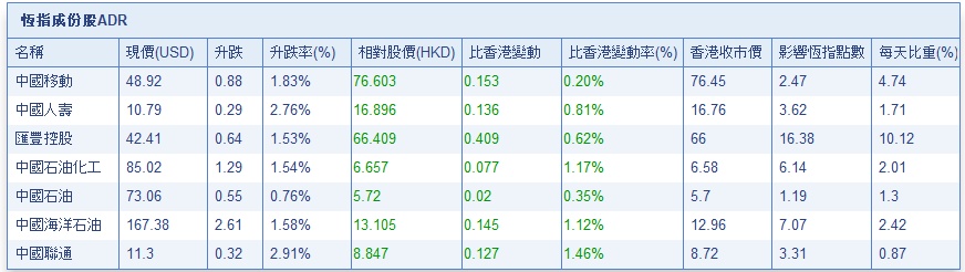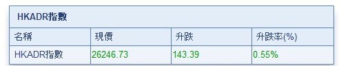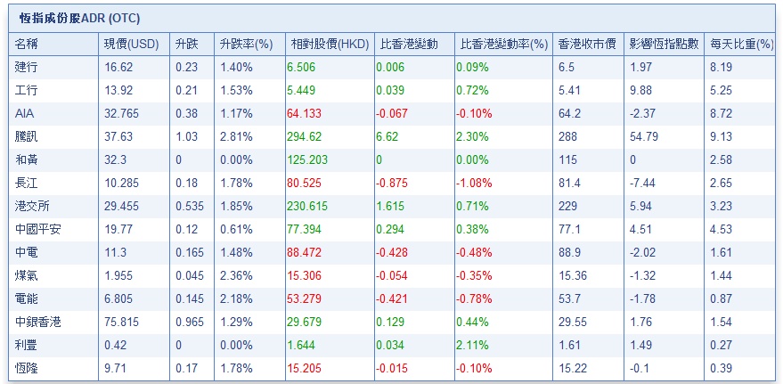 智通财经APP获悉,隔夜美股反弹,刺激港股ADR指数全日向好,按比例计算,收报26246.73点,升143.39点或0.55%。大型蓝筹全线靠稳,汇丰控股收报66.39元,较港收市升0.39元;腾讯控股收报294.62元,较港收市升6.62元。内银股向好,建设银行收报6.51元,较港收市升0.01元;工商银行收报5.45元,较港收市升0.04元。