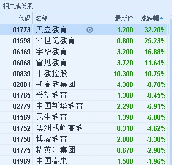 智通财经APP于早知道中提示到,政策在8月底的民促法草案之后,再次出手扰动教育板块:上市公司不得通过股票市场融资投资营利性幼儿园,民办园不准单独或作为一部分资产打包上市。小编翻阅了目前教育板块上市公司的半年报或者招股书,影响最大的是博骏教育,占收入的26.8%,其次是21世纪教育的14.25%,天立教育、宇华教育和枫叶教育也受到影响。这个政策的出台虽然只是直接影响这几家公司,但是从这里也可以看出监管的思路,对于整个教育板块都有冲击,在民促法落地之前,教育板块的盈利和估值无法确定,还是需要谨慎参与。