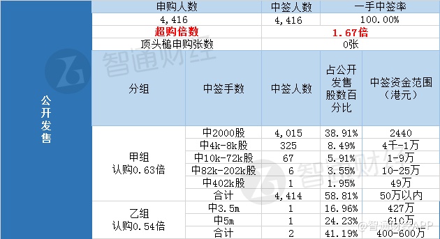 其中,公开配售申购人数4416人,一手中签率100%,认购倍数1.67倍。
