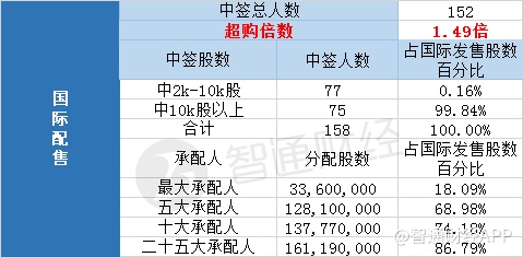 国际配售中签总人数152人,认购倍数1.49倍,总金额2.26亿。
