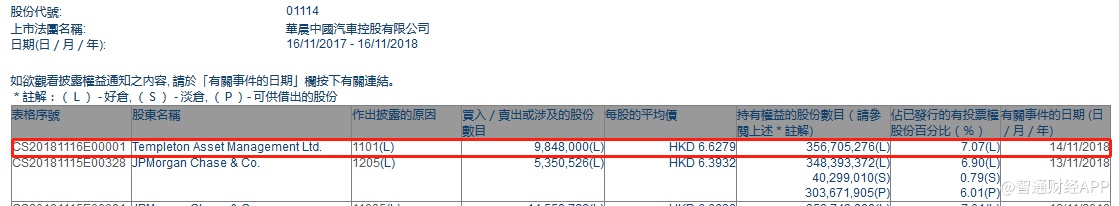 智通财经APP获悉,根据联交所资料显示,Templeton Asset Management Ltd于11月14日增持华晨中国(01114)984万股,每股作价6.63港元,总值约6523.9万港元,最新持股量增至7.07%。