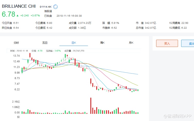 截至今日收盘,华晨中国(01114)报6.78港元,涨3.67%。
