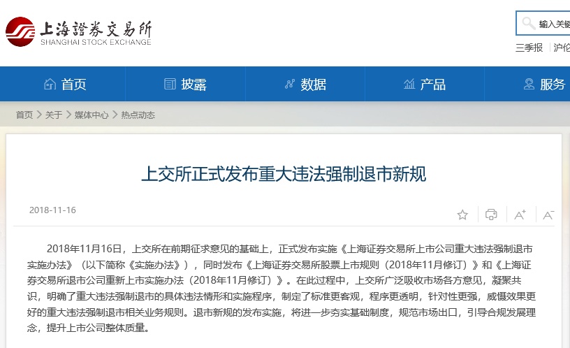 2018年11月16日,上交所在前期征求意见的基础上,正式发布实施《上海证券交易所上市公司重大违法强制退市实施办法》(以下简称《实施办法》),同时发布《上海证券交易所股票上市规则(2018年11月修订)》和《上海证券交易所退市公司重新上市实施办法(2018年11月修订)》。在此过程中,上交所广泛吸收市场各方意见,凝聚共识,明确了重大违法强制退市的具体违法情形和实施程序,制定了标准更客观,程序更透明,针对性更强,威慑效果更好的重大违法强制退市相关业务规则。退市新规的发布实施,将进一步夯实基础制度,规范市场出口,引导合规发展理念,提升上市公司整体质量。