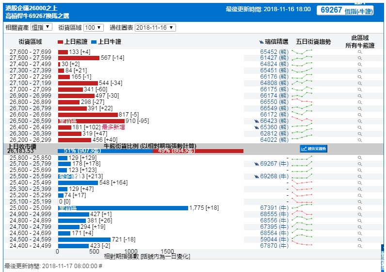 智通财经APP获悉,截至11月17日,恒指最新的牛熊街货比例51:49。从瑞信恒指牛熊证街货分布图中得到的数据显示,熊证街货重货区在26500-26599区间,该区间熊证数量为910张,比上一交易日减少95张;最多新增在26400-26499区间,新增102张。牛证中重货区在25000-25099区间,该区间最新牛证数量为1775张,比上一交易日增加19张;最多新增在25500-25599区间,新增213张。