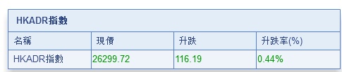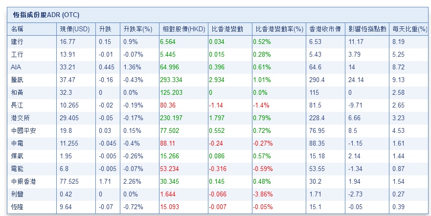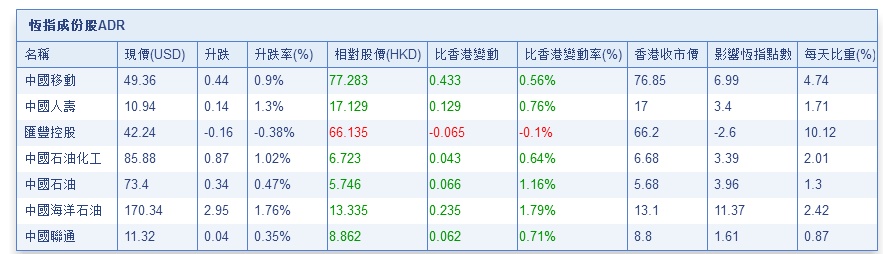 智通财经APP获悉,隔夜美股大体收高,港股ADR盘中拉升,按比例计算,收报26299.72点,升116.19点或0.44%。大型蓝筹上涨居多,汇丰控股收报66.135元,较港收市跌0.065元;腾讯控股收报293.33元,较港收市升2.93元。内银股、电信股、石油股向好。