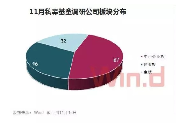 Wind数据显示,截止11月16日,11月份私募基金合计调研了145家上市公司,这些调研对象包括67家中小板公司、46家创业板公司,32家主板公司,中小创依旧是焦点,合计占比约78%。