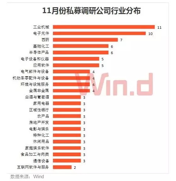 从行业分布来看,11月份,工业机械行业以7.59%的关注度位列私募关注度榜首,其次是半导体产品、基础化工、西药和电子元件行业,私募关注度分布为6.9%、4.83%、4.14%、4.14%。