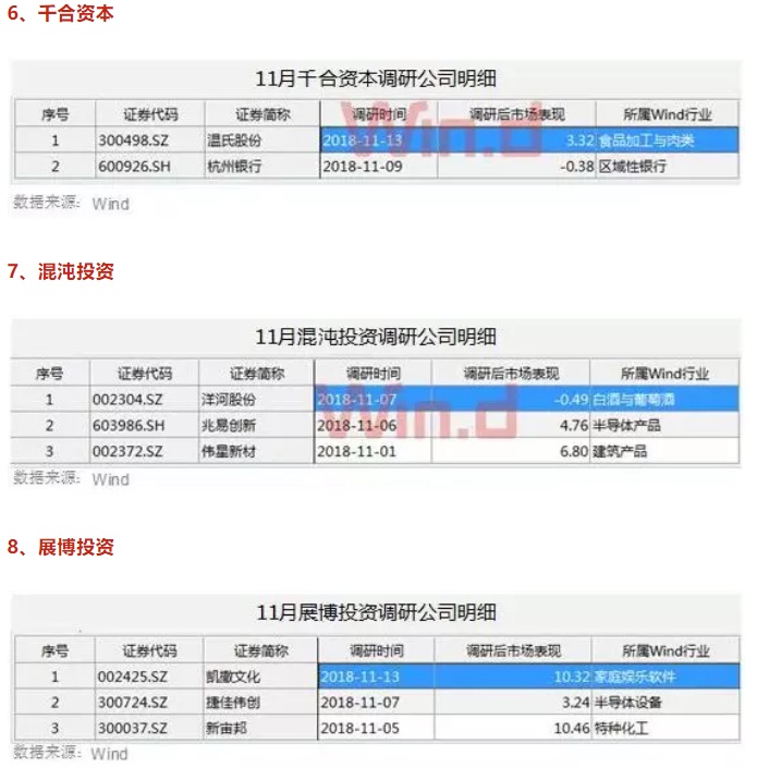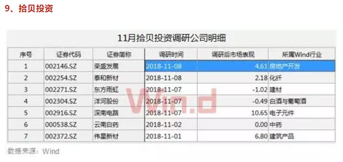 Wind数据进一步统计显示,11月以来参与调研的522家私募基金中,不乏千合资本、星石资产、景林资产、拾贝投资、高毅资产、淡水泉投资等百亿级明星私募。