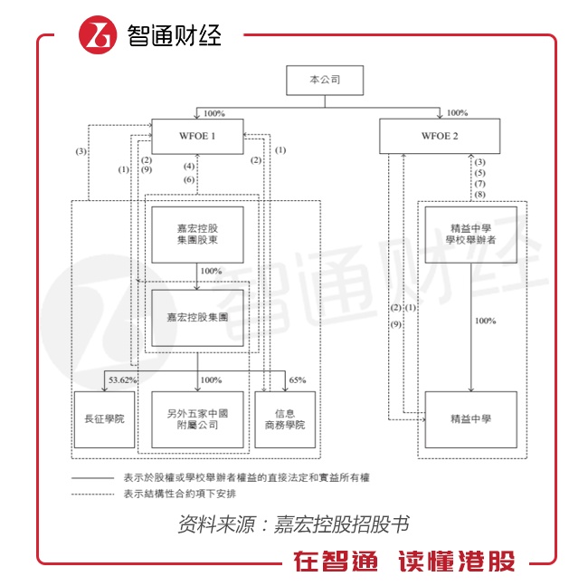 嘉宏教育旗下共有3所学校,共有在校生约3.2万人,其透过结构性合约控制并经营两所学校,即长征学院和精益中学,此外,嘉宏教育运营着一所合营学校,即信息商务学院,该校由嘉宏控股集团持有其65%出资人权益。具体的股权结构如下:
