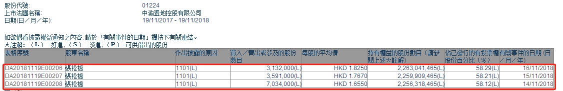 智通财经APP获悉,根据联交所资料显示,张松桥于11月14日、15日、16日分别增持中渝置地(01224)703.4万、359.1万、313.2万股,每股作价分别为1.66港元、1.77港元、1.83港元,总值约2376.4万港元,最新持股量增至58.29%。