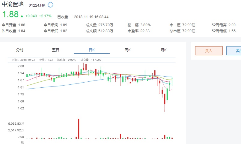 截至今日收盘,中渝置地(01224)报1.88港元,涨2.17%。