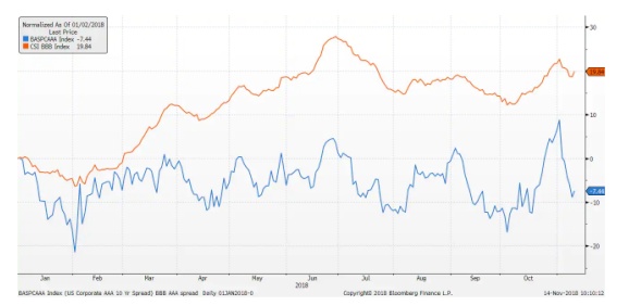 如果我们观察一下美国高评级公司债,就会发现,BBB评级、评级较低的公司债将整体投资级债券的评级拉低了。如下图所示,年初至今,AAA级债券和美国国债的利差已经收窄了7%,而BBB级公司债和美国国债的利差已扩大了20%。