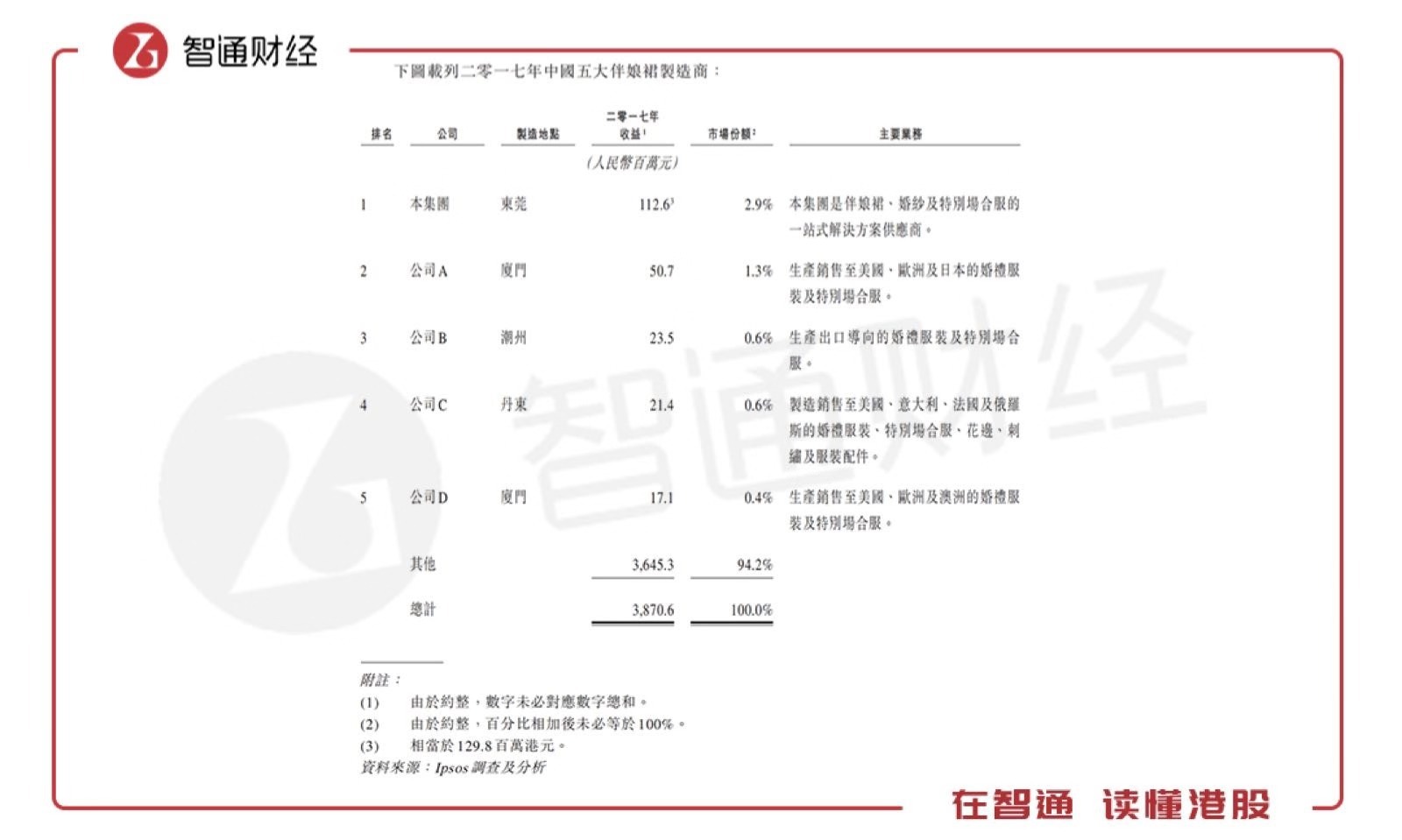 据智通财经APP了解,11月15日向港交所递交招股说明书的嘉艺控股,是一家伴娘裙、婚纱及特别场合服的一站式解决方案供应商,根据Ipsos报告,就收益而言,公司为2017年中国最大的伴娘裙制造商,约占2.9%的市场份额。