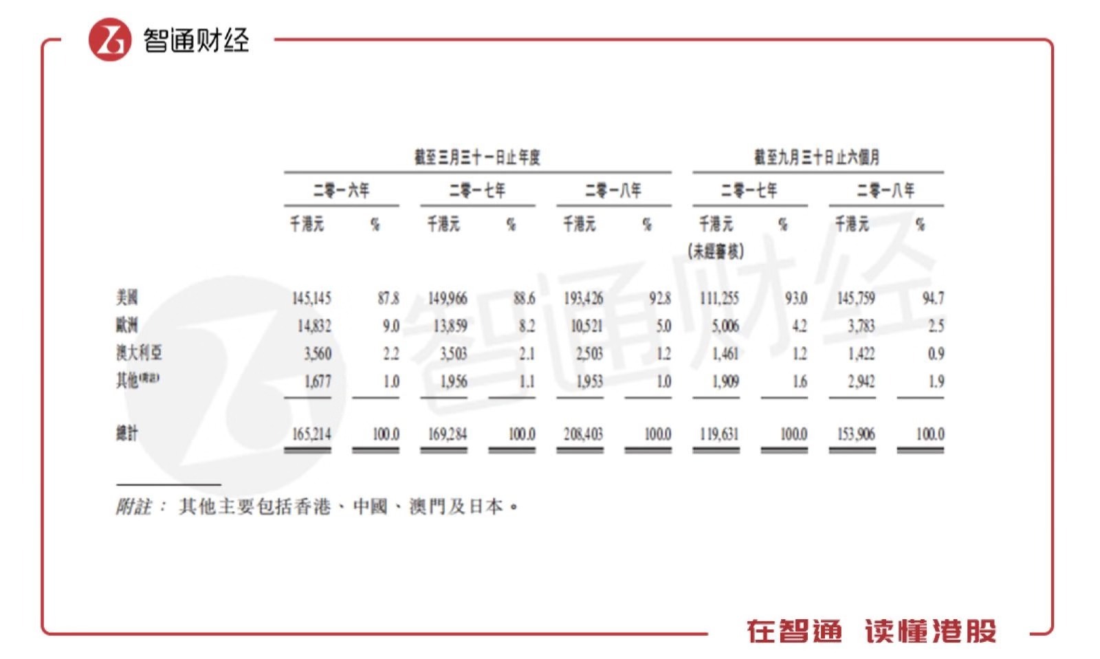 嘉艺控股招股书显示,公司产品销往世界各地,主要包括美国、欧洲、澳大利亚、中国及日本等等。其中,美国为公司最大市场,2018财年,公司来自美国的收入为1.93亿港元(单位下同),占公司总收入的92.8%。