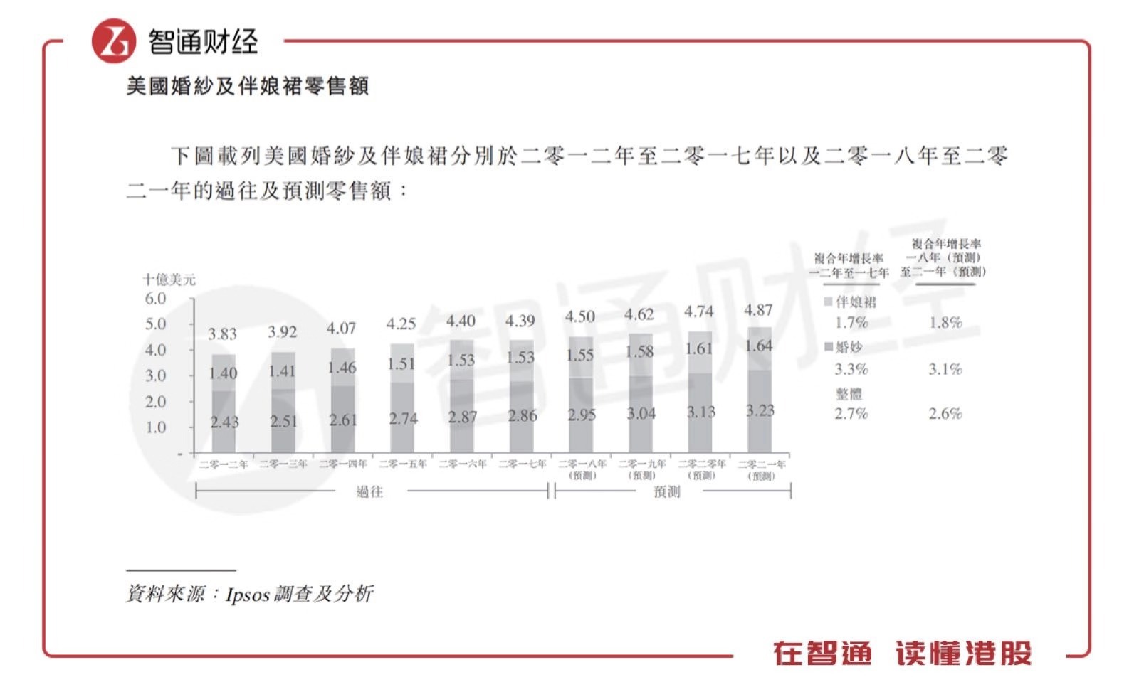 根据Ipsos的调查分析结果,2018年至2021年美国婚纱及伴娘裙的零售额复合增长率仅有2.6%,欧洲、澳大利亚和中国的婚纱及伴娘裙同期零售额复合增长速度分别为1%,2.2%和5%。