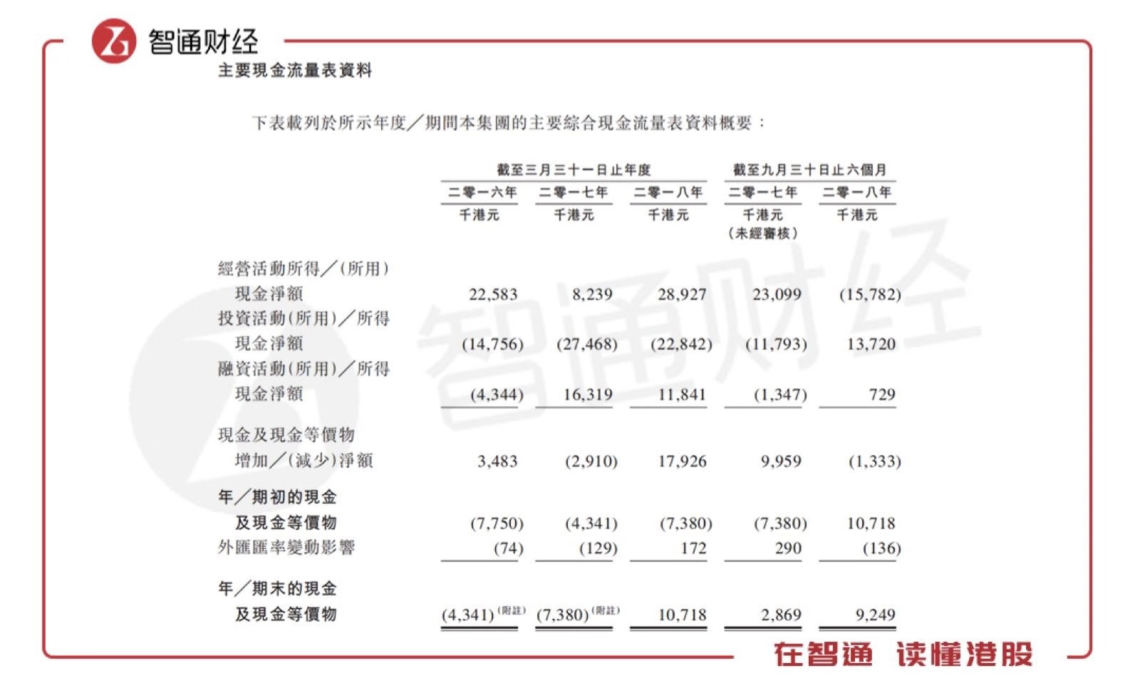 可见,如果嘉艺控股预计新增的产能能够顺利投产,能够极大提升公司产能。但目前摆在公司面前的难题是,公司资金处于紧缺状态。公司主要现金流量表资料显示,截至2018年9月30日止6个月,公司经营活动所用现金净额为1578.2万元,期末现金及现金等价物为924.9万元。通常来说,一家公司这样的现金流表现是很难支撑公司大规模扩张的。
