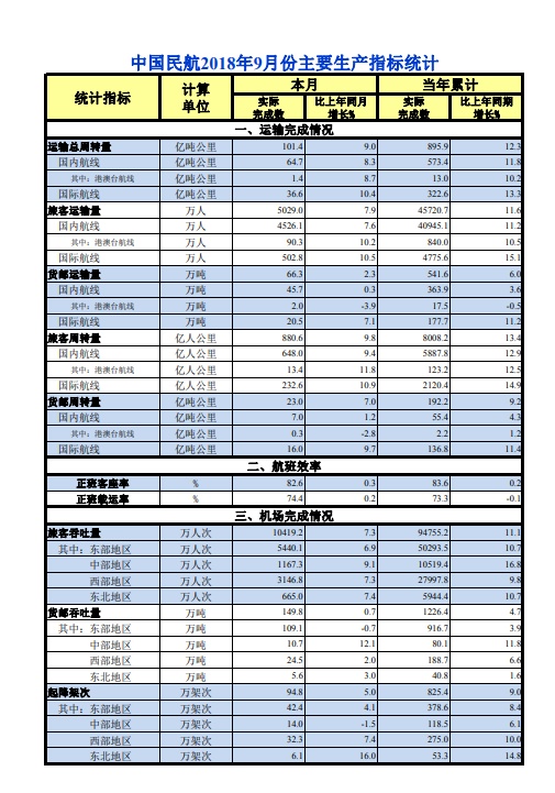 智通财经APP获悉,中国民用航空局今日发布的主要运输生产指标统计显示,今年9月,运输总周转量达到101.4亿吨公里,同比增长9%;中国民航旅客运输量达到5029万人,同比增长7.9%,当年累计运输量已达4.57亿人;9月货邮运输量为66.3万吨,同比增长2.3%。