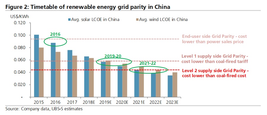 用户侧平价上网在2016年已经可以实现,瑞信认为,第一、二层次的发电侧平价上网预计分别在2019-2020年、2021-2022年实现,比之前预期的快1-2年。