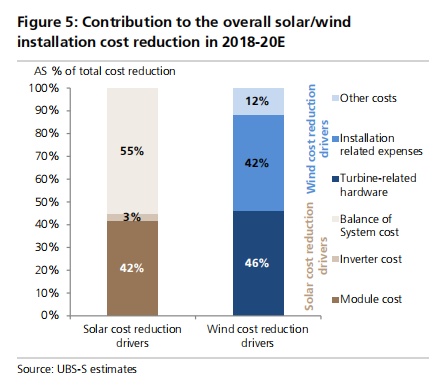 要实现平价上网,最关键是要降低装机成本。瑞银认为,降成本对于无论在光伏还是风电领域都是NO.1的中国来说不是什么难事,预计2018-2020年,光伏、风电的装机成本分别下降40%、16%。