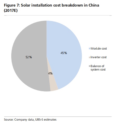 光伏装机成本主要包括光伏模组成本(多晶硅/晶圆/电池/组件成本)、逆变器成本、系统平衡部件(BOS)成本,瑞银预计2018-2020年,这三部分成本分别下降41%、33%、40%。