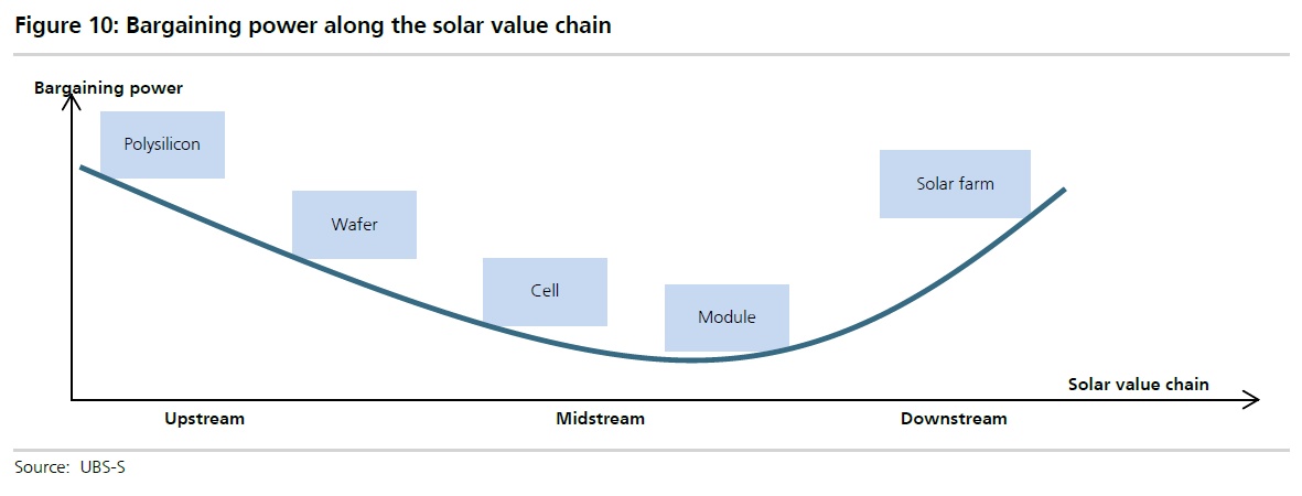 在光伏产业链上,上中下游议价能力的强弱呈现出“微笑曲线”,处于曲线两端的是议价能力比较强的上游(特别是多晶硅)和下游(光伏电站开发商),中游(电池和组件)是价格的接受者,毛利率相对更低。瑞银估计,多晶硅、晶圆、电池、组件的长期毛利率分别稳定在25%、20%、15%、13%左右。