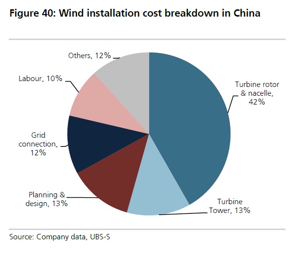 风力发电方面,中国超过98%的已有风电项目是陆上风电项目,瑞银预计未来的增量也以陆上风电为主。陆上风电装机成本主要有两部分构成:与涡轮机相关的硬件成本、安装费用,硬件成本占比60-70%,降低风电的装机成本主要是降低硬件成本。但由于产业链相对短,风电降成本的空间不如光伏。