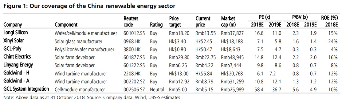 具体到个股标的,瑞银认为平价上网刺激可再生能源需求增长,上游的光伏/风电制造商最先受益,首选隆基股份(601012.SS)、信义光能(00968.HK)、金风科技(02208.HK)、保利协鑫能源(03800.HK)。