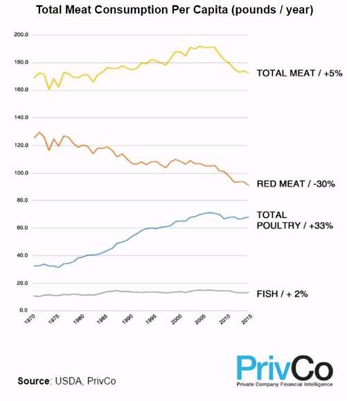 另据美国农业部数据显示,美国肉类消费处于下降趋势。2005年曾是美国人均肉类消费的最高峰。随着健康问题、环保意识、技术突破等因素的影响,植物蛋白的需求大幅上扬。从2007到2014年,美国人均肉类消费下降近10%,而这一比例的空缺,正被植物食品所替代。
