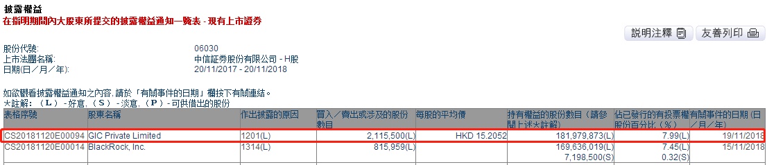 智通财经APP获悉,根据联交所资料显示,GIC Private Ltd于11月19日减持中信证券(06030)211万股,每股作价15.21港元,总值约3029.3万港元,最新持股量减至7.99%。