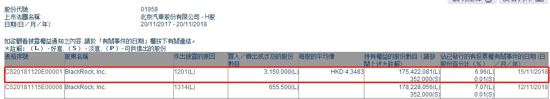 智通财经APP获悉,根据联交所资料显示,贝莱德于11月15日减持北京汽车(01958)315万股,每股作价4.35港元,总值约1370万港元,最新持股量降至6.96%。