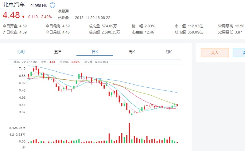 截至今日收盘,北京汽车(01958)报4.48港元,跌2.4%。
