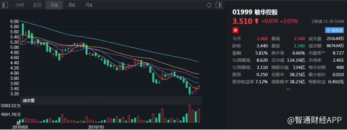截至今日收盘,敏华控股(01999)报3.51港元,涨2.03%。