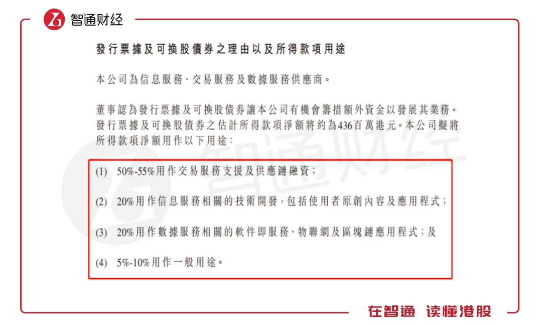 智通财经获悉,11月16日,慧聪集团(02280)与建银国际订立投资协议,慧聪以可转债(CB)+票据的方式向建银国际融资,其中CB为3.5亿港元,可转债1亿港元,融资所得净额共4.36亿港元。其中CB的换股价为6港元,相对于上一个交易日收盘价溢价达25.5%。