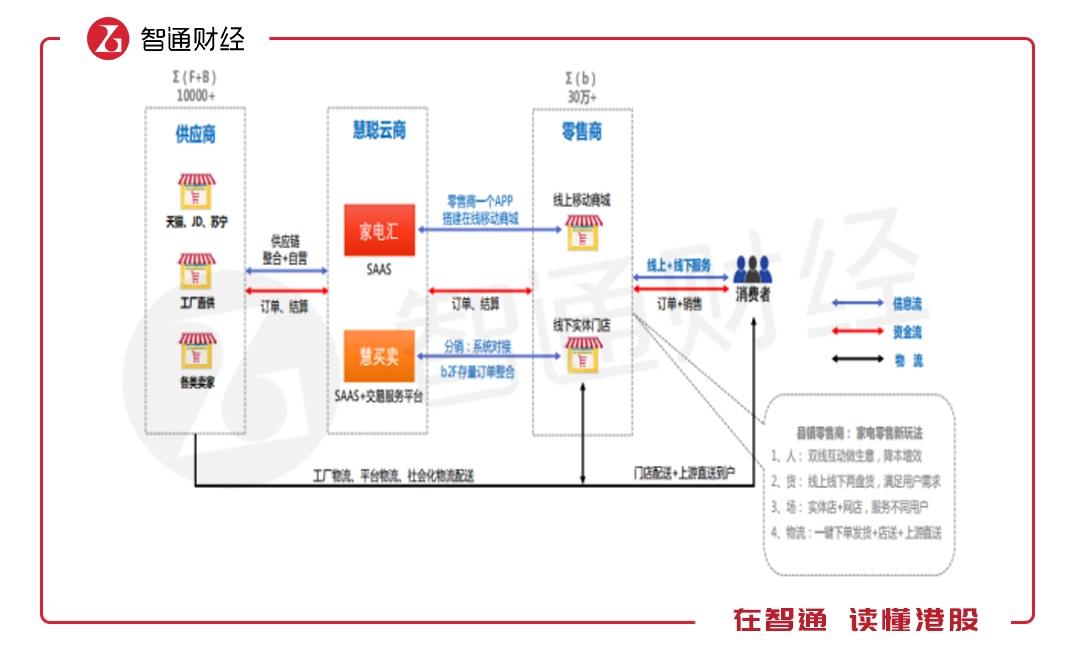 慧聪云商由家电汇和慧买卖构成,这两大平台连接了供货商,包括厂家、电商和代理商,以及零售商,包括移动商城和线下实体店,通过线上线下服务将货品到达最终的消费者手里。慧聪云商起到平台搭建的作用,不管是家电供货方还是售货方均可以成为该平台的合作伙伴。
