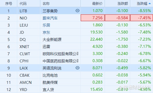 截至发稿,兰亭集势(LITB.US)跌8.55%,蔚来汽车(NIO.US)跌7.45%,乐居(LEJU.US)跌6.53%,京东(JD.US)跌7.48%,阿里巴巴(BABA.US)跌3.62%。