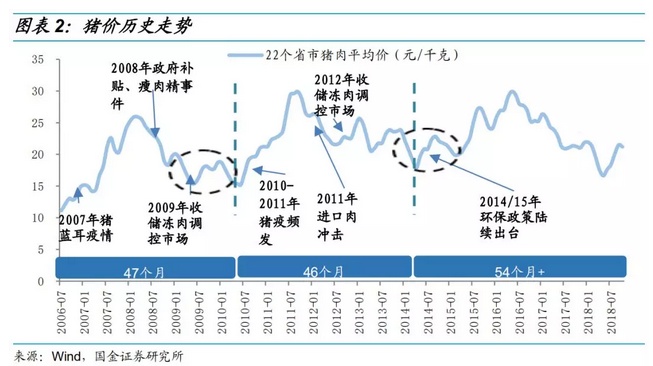 2018年8月以来,我国部分地区发现了非洲猪瘟疫情,之后疫情不断向其它省市扩散,猪价短期快速回升。国庆节后,随着疫情得到有效控制,十月猪价涨幅收窄,但11月17日上海市金山区排查出非洲猪瘟疫情,仍给未来猪价走势再添变数。本文通过梳理猪周期的历史规律,对本轮猪周期的走势进行分析,以判断其对2019年通胀的影响。