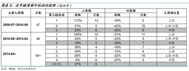 2)平均每个大周期包含3轮扰动,本轮超长周期已经包含近5轮扰动,目前是大周期下行期的小反弹。猪价本身的季节性决定了扰动的必然存在,第一轮大周期中包含3轮扰动,上涨期24个月,回落期23个月。第二轮大周期中包含3轮扰动,上涨期25个月,回落期21个月。从历史规律来看,现在大致处在每轮大周期筑底时的第二轮上涨中,前两轮上涨的过程均持续了1年,目前猪价已经从低点上升约27%,如果猪周期没有失灵,历史经验判断预计本次扰动至少会从2018年5月持续至2019年6月。
