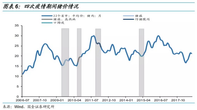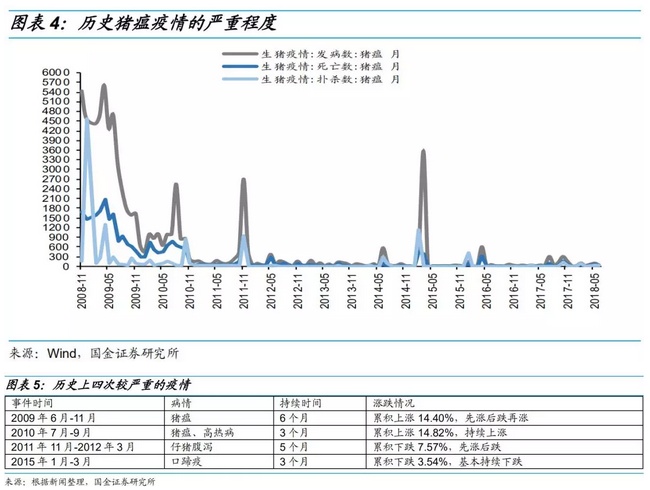 关于本次非洲猪瘟,我国首例疫情于今年8月在辽宁发现,此后疫情不断向其它省市扩散,截至10月底,已有11个省市发现数十起非洲猪瘟病例,已扑杀生猪数量超过 3 万头。我们选取历史中严重程度最高的四次疫情,探讨疫情发生期间猪价的变动情况,以此估算本次非洲猪瘟的持续时间及对猪价的影响。