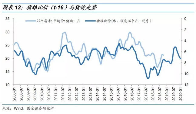 根据养殖利润-补栏-存栏-出栏-猪价的链条,养殖利润的提升传导至养户做出补栏举动这一过程的时滞约1个月;补栏到存栏,即母猪幼仔培育成能繁母猪约4个月,母猪怀孕产仔约4个月;存栏到出栏,即仔猪培育成出栏肥猪约6个月,因此,猪粮比价大致领先猪价15、16个月。