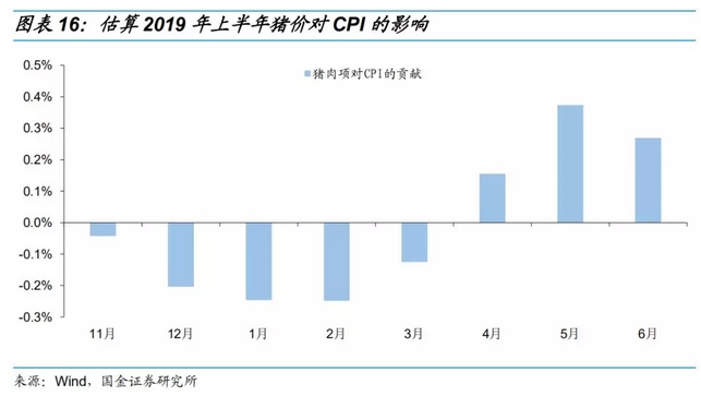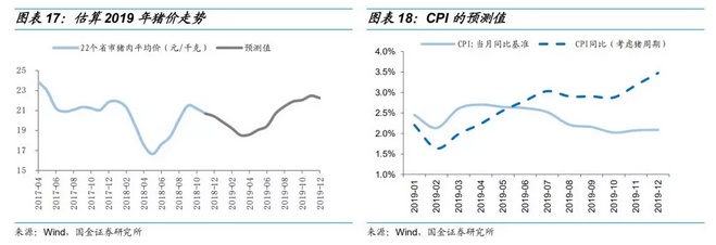 如果猪瘟影响范围扩大,产能出清状况加速改善, 预计2019年6月份新一轮猪周期开启。基于以往猪周期启动之后的月均价格环比变化,我们判断2019年下半年猪价(22个省市平均猪价)上涨至20.72—22.26元/千克区间,推动下半年CPI中枢上升至3.1%,2019年末通胀压力有所显现。