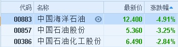 国际油价暴跌,拖累港股“三桶油”全线下挫。NYMEX原油期货收跌6.66%报53.39美元/桶,创一年多以来新低,今年以来累计跌幅超11%。股市下跌,投资者担心全球石油需求疲软。早盘中海油(00883)跌4.91%,报12.4港元,中石油(00857)跌3.25%,报5.36港元,中石化(00386)跌2.84%,报6.49港元。