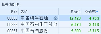 智通财经APP获悉,受国际油价大跌影响,“三桶油”集体下挫。截至9时37分,中海油(00883)跌4.75%,报价12.42港元,中石化(00386)跌3.14%,报6.47港元,中石油(00857)跌2.71%,报5.39港元。