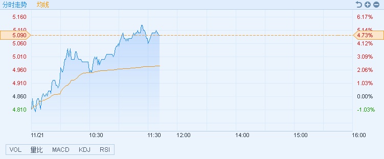 智通财经APP获悉,耗资2415.6万港元回购500万股,新城发展控股(01030)股价走强。截至11时41分,涨4.73%,报价5.09港元,成交额1.87亿。