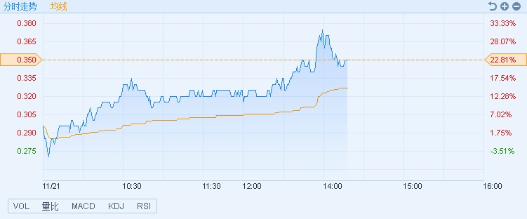 智通财经APP获悉,中新控股(08207)涨势延续,连续两个交易日累计涨幅超46%,截至14时17分,涨22.81%,报价0.35港元,成交额1379.97万。